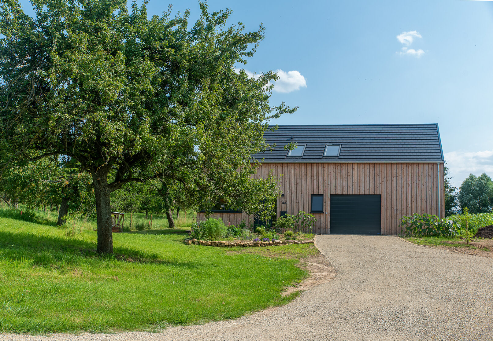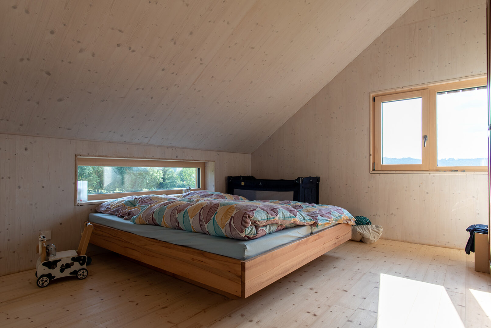 Aufgrund des hohen Vorfertigungsgrades und der damit verbundenen geringen Toleranzen war die Kombination des Holzbaus mit dem vorab errichteten, massiven Gebäudeteil problemlos umsetzbar. Die einfache Formsprache des Hauses und die Fassade aus einheimischer Douglasie harmonieren mit den umliegenden Scheunen und Landwirtschaftsgebäuden und passen sich gut in die natürliche Umgebung ein.