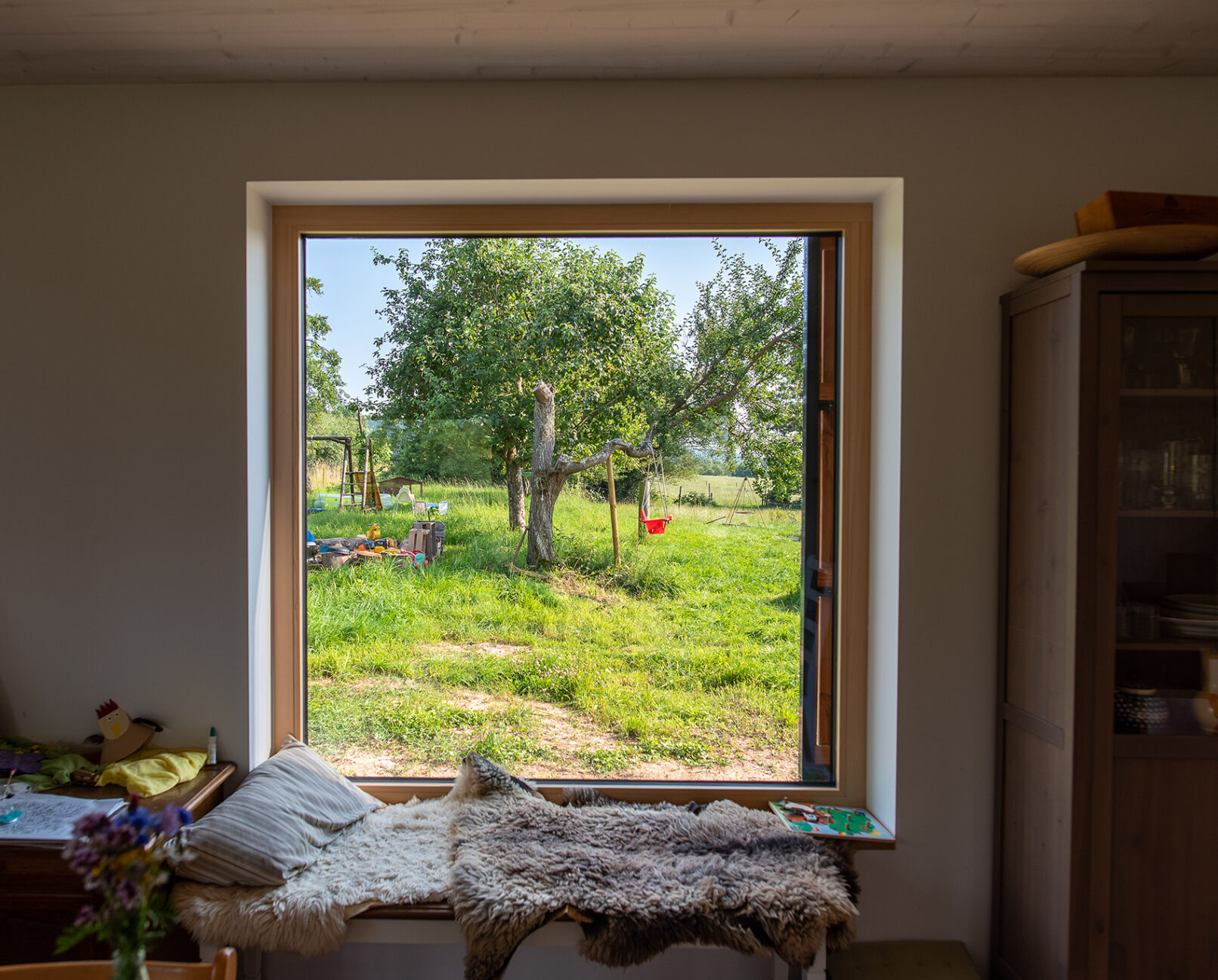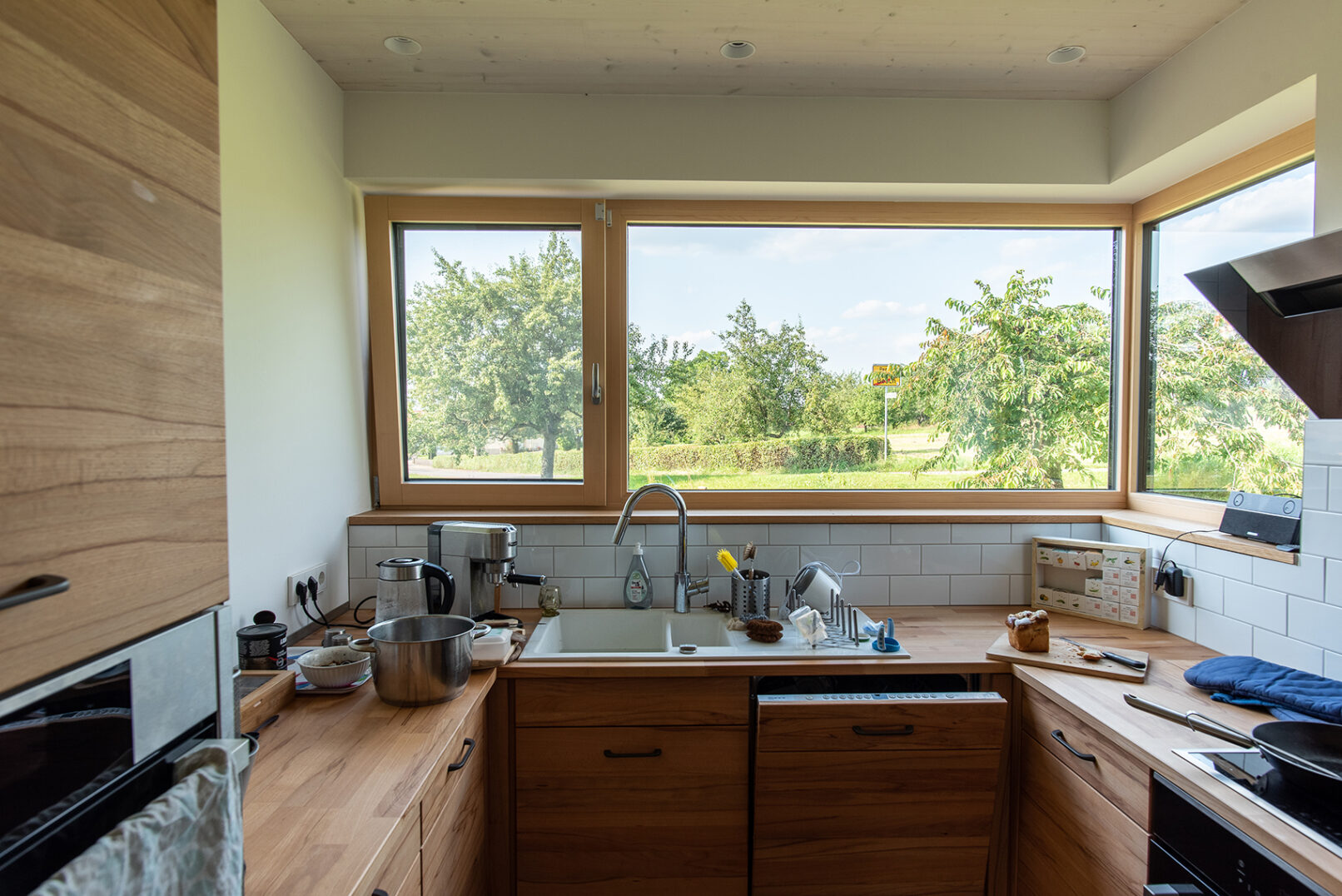 Die Innenräume öffnen sich zu den umliegenden Streuobstwiesen mit vielfältigen Blickbeziehungen zur Natur und Topografie des Moseltals. Durch den Fassadenrücksprung auf der Südseite konnte trotz großflächiger Verglasung auf teure und im Sommer störende Verschattung verzichtet werden. Der im Winter bei tiefstehender Sonne erzielte solare Gewinn wirkt sich positiv auf die Energiebilanz und das Wohlbefinden der Bewohner aus.