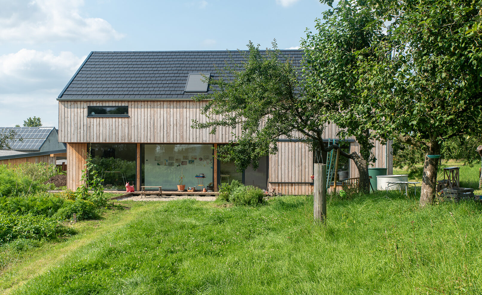 Zwischen alten Obstbäumen und in direkter Nähe zu einem Bauernhof entstand dieses Einfamilienhaus für ein Tierarzt-Ehepaar mit drei Kindern. Im Vordergrund stand bei diesem Projekt der Wunsch nach gesunden, nachhaltigen und robusten Materialien, die durch ihre Dauerhaftigkeit trotzdem ökonomisch einzusetzen sind.