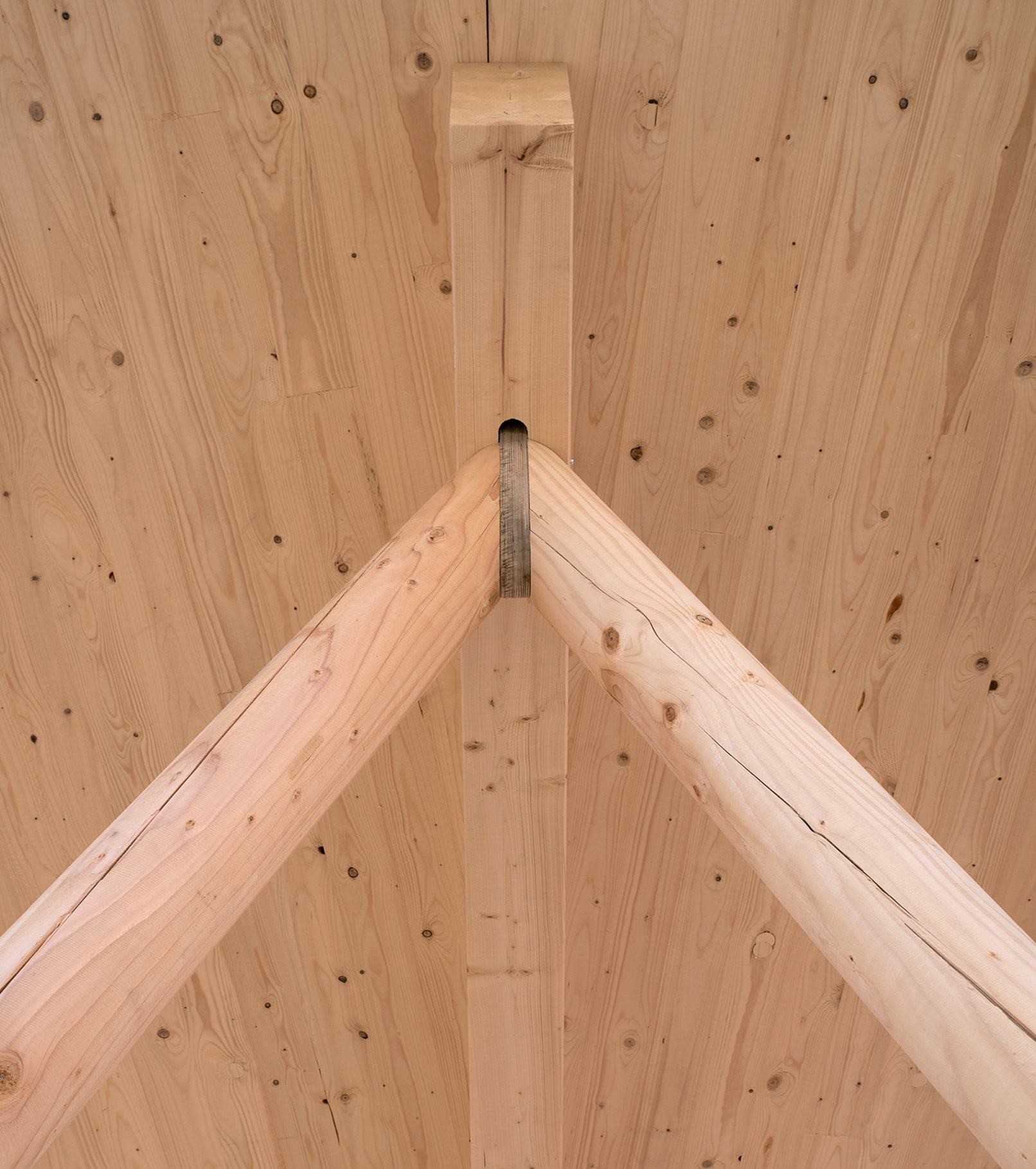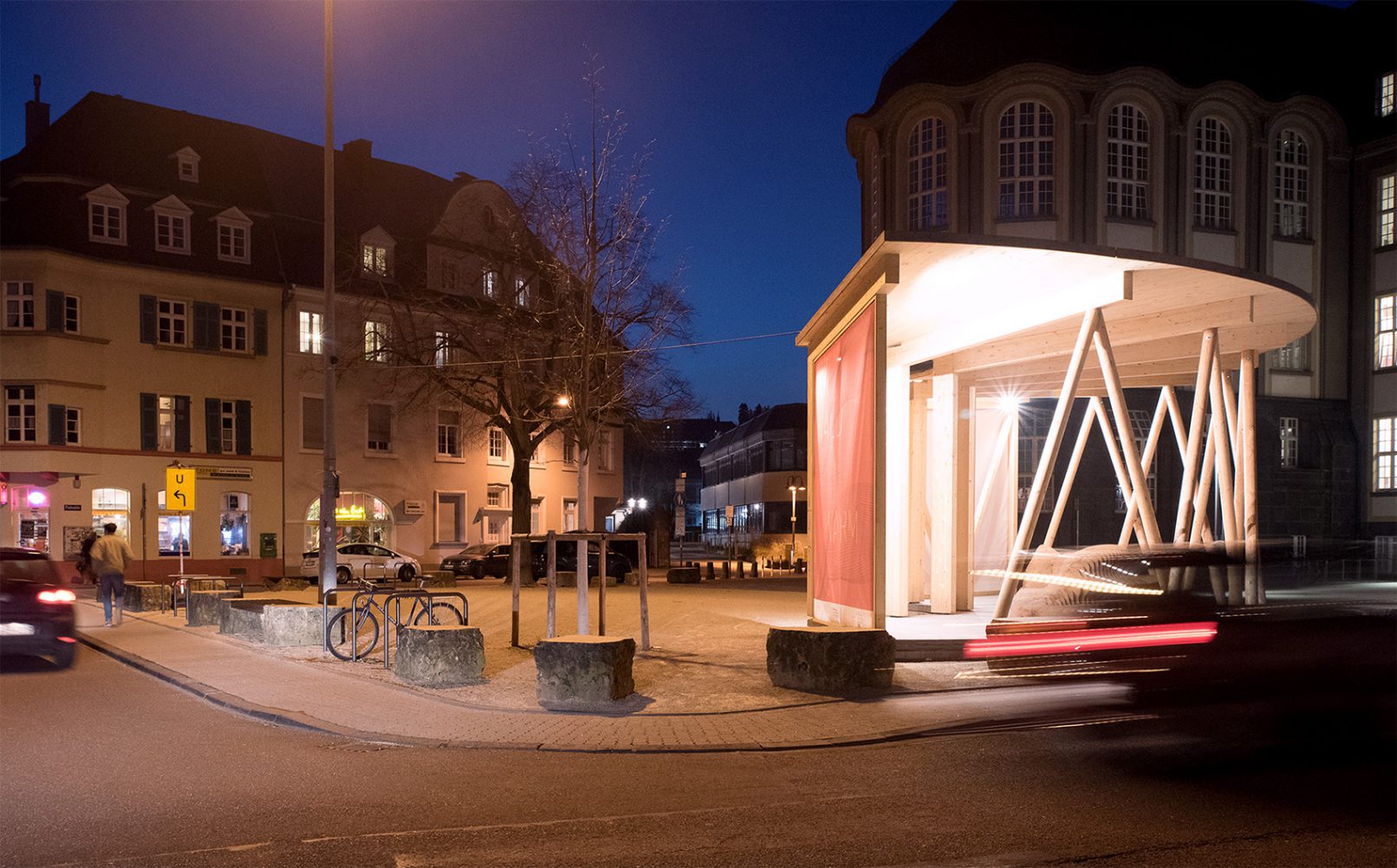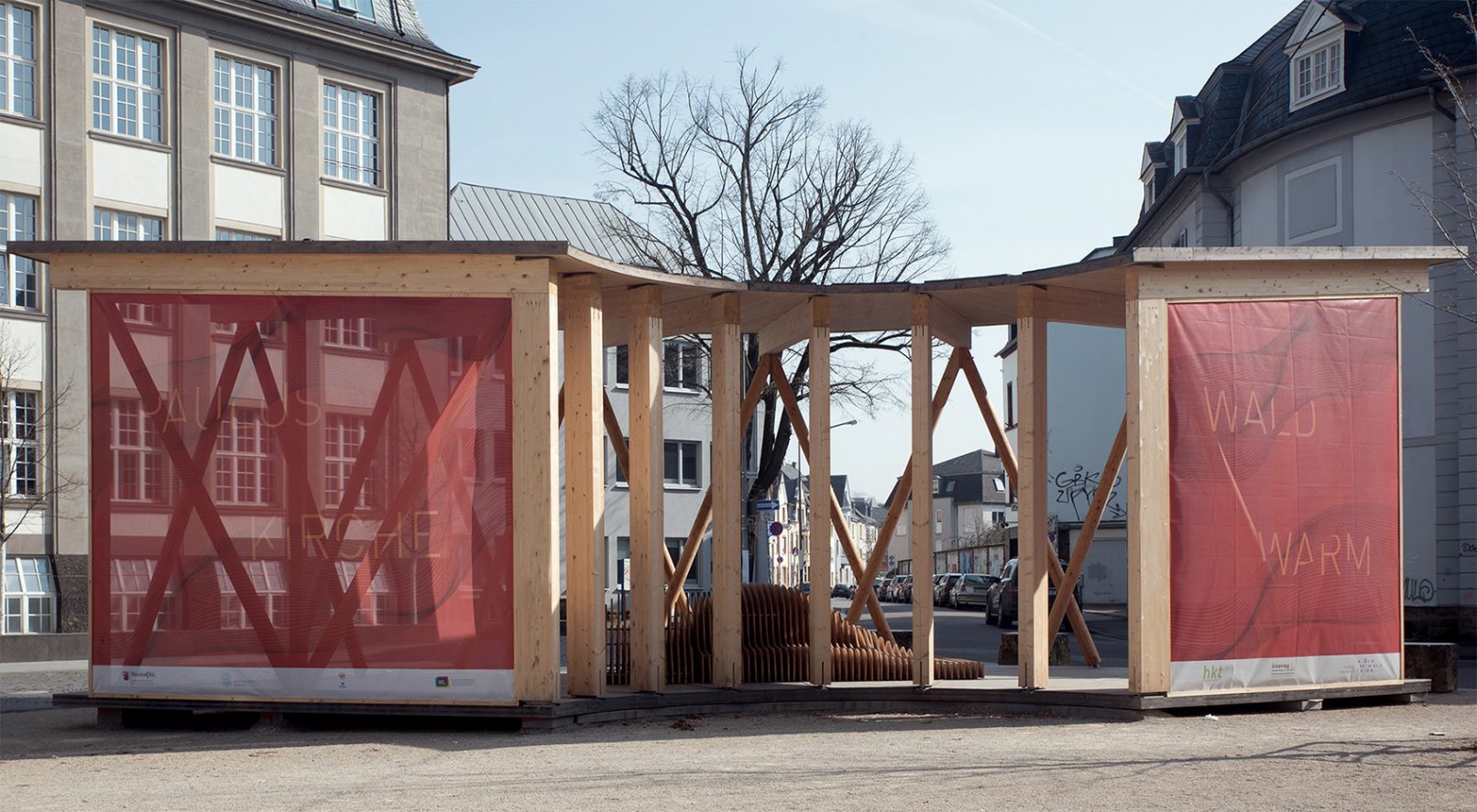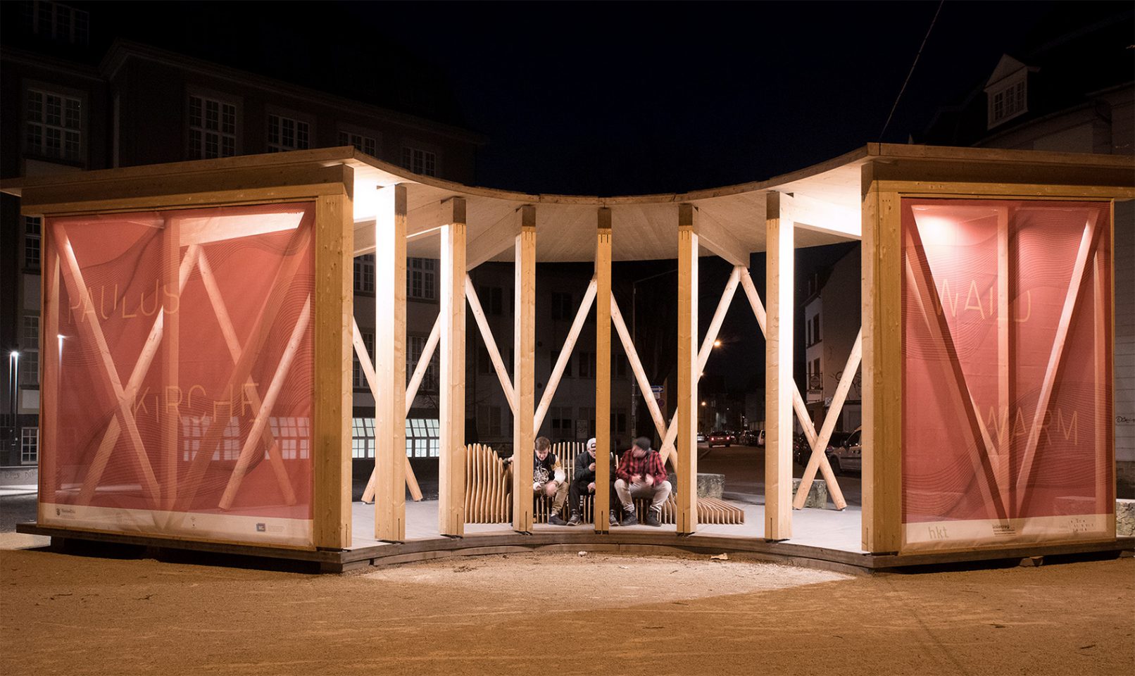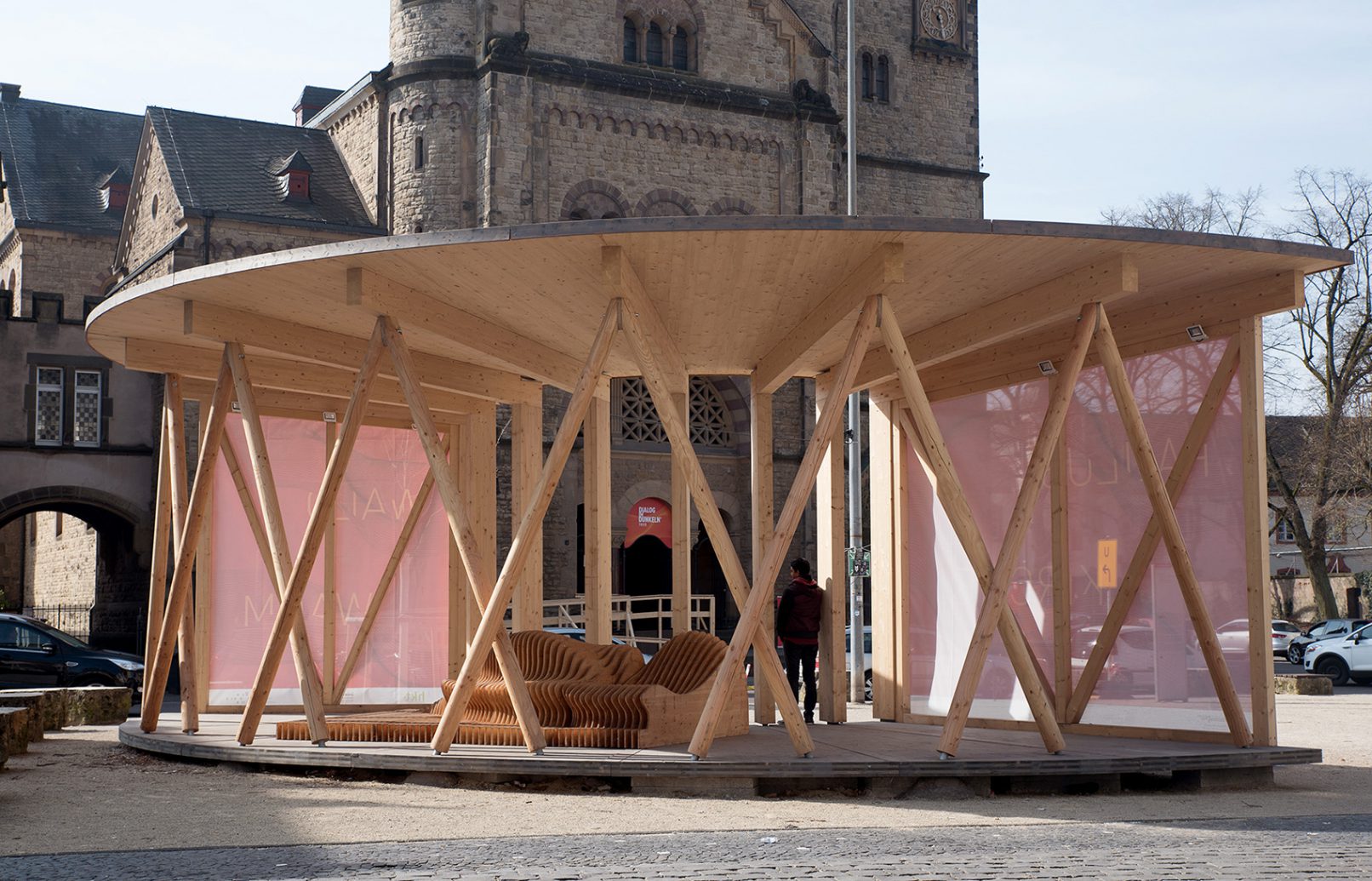 Im Rahmen unsere Mitarbeit beim Holzkompetenzzentrum, HKT, an der Hochschule Trier, entstand ein temporär Pavillon. Für den bislang wenig attraktiven Raum vor dem Hochschulgebäude am Paulusplatz in Trier wurde eine überdachte Freifläche geschaffen, welche die Idee des historischen „Reißbodens“ oder „Schnürbodens“ mit Mitteln moderner parametrischer Entwurfswerkzeuge der Architektur, sowie CAD/CAM-Werkzeugen des Holzbaus umsetzt. Über mehrere Semester wurde gemeinsam mit Studierenden der Fachrichtung Architektur eine Struktur entworfen, untersucht und optimiert, um diese dann im Herbst 2018 mit Unterstützung regionaler Holzbaufirmen zu errichten. Ein im Vorfeld mit Studierenden errichteter Prototyp brachte wertvolle Erkenntnisse für die endgültige Umsetzung. Der Pavillon diente bis Ende 2019 der Ausstellung „Dialog im Dunkeln“ in der Pauluskirche als Außenwerbefläche sowie als Veranstaltung-und Aufenthaltsort. Um den Entwurf zu realisieren wurde am HKT entwickelten Knotenpunkten eingesetzt. Entwurf: Prof. Dr. Wieland Becker, Eirik Kjølsrud und Jan Weber.